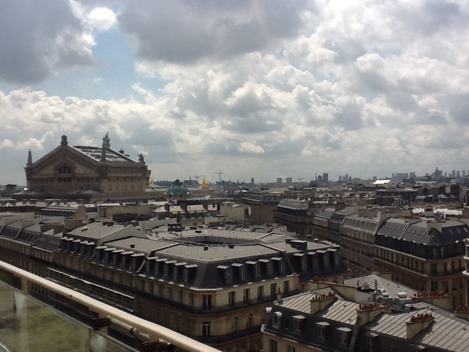 Ja, wolkig war es, ziemlich sogar. Die Tribüne für den Nationalfeiertag war schon zusammengeschraubt und die Schlange vor den Seerosen von Monet sogar sehr kurz. Die Kaufhäuser hatten zum Ansturm auf den Sommerschlussverkauf gerüstet. Alles war reduziert! Und so konnte man sich Rolltreppe um Rolltreppe in den drei Verkaufstürmen des Le Printemps hochschrauben. Ein Turm war für Wohnen und Drumrum, einer für Frauenmode, einer für Männermode.Püppchen sorgten dafür, dass man bloß nicht zuviel Parfumnebel zerstäubte. Andere Püppchen glaubte, was in meiner Größe zu haben. Was heißt Länge auf Französisch? Jedenfalls ist das Ziel nicht ein Designerschlampenjäckchen, das man hier auf dem Land eh nicht zu würdigen weiß, sondern der oberste Stock. Im Frauenmodeturm wartet eine Kuppel mit atemberaubender Verglasung und im Wohnturm eine herrliche Aussicht über die Stadt, mit Parkbänken und Kunstrasen. Ja nun, jetzt kämen traditionell die Fotos. Kuppel, Parkbank, Aussicht. Die müssen Sie sich bitte vorstellen.Technische Probleme hindern mich gerade dran, sie im Original der Weltöffentlichkeit zur Verfügung zu stellen. Dafür war das Ipad mit und durfte auch auf den Eifelturm gucken.