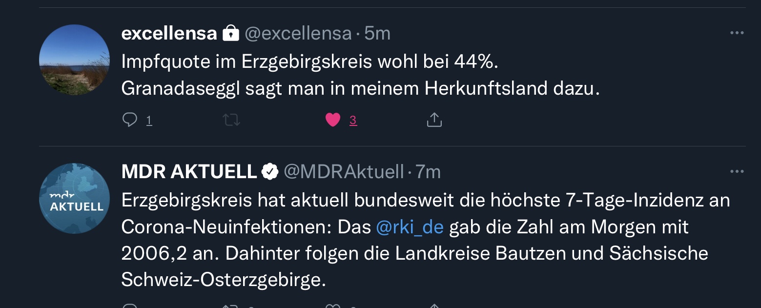 44% Impfquote im Erzgebirge. Ich gehöre einer Minderheit an, das hätte ich mir auch mal nicht träumen lassen.