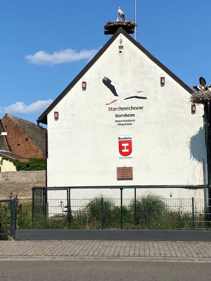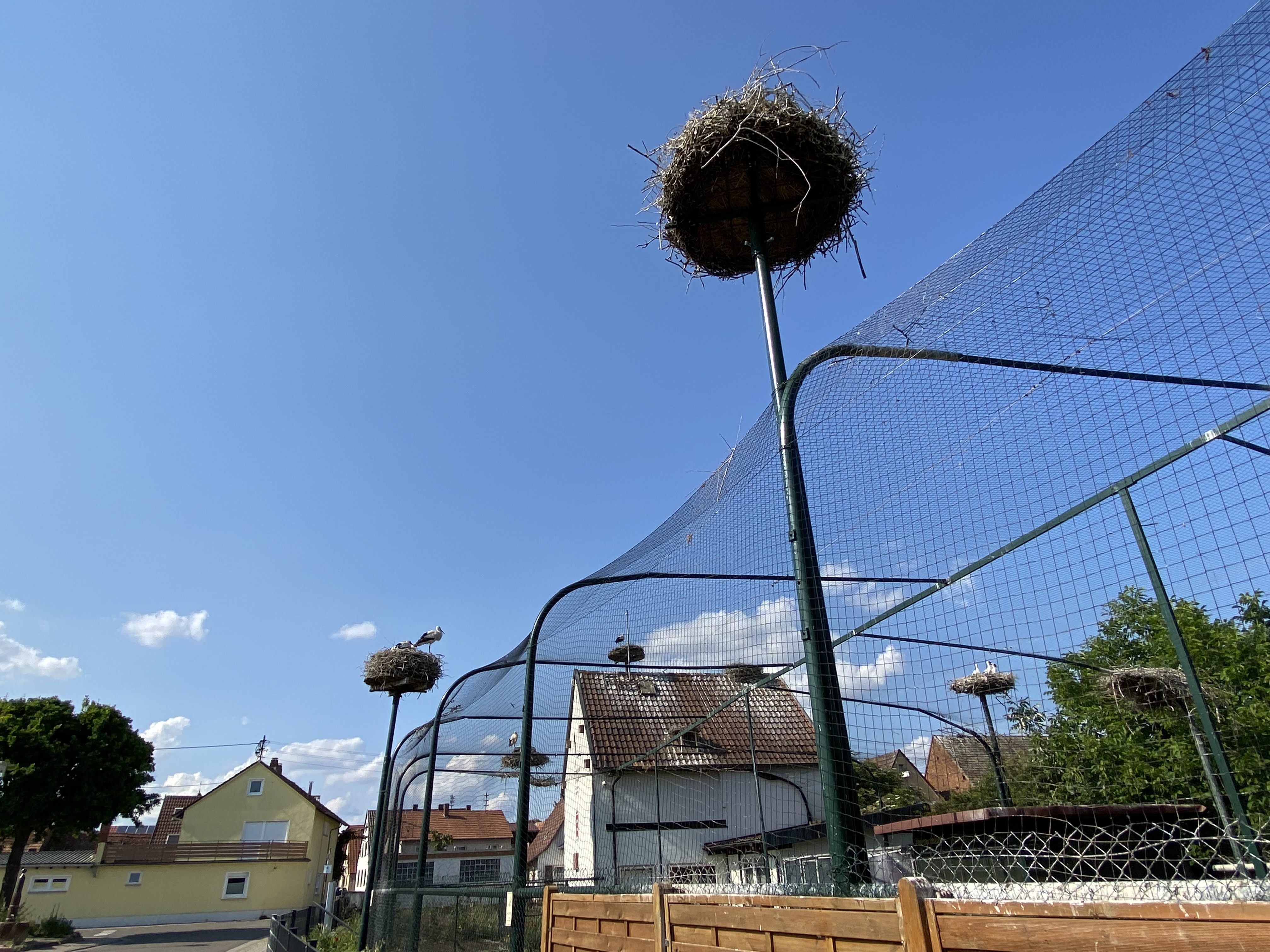 Auf der Rückfahrt haben wir uns die Storchenaufzucht in Bornheim angeschaut. Das Museum hatte leider gerade zugemacht, doch konnte man die Voliere sehen, in der flugunfähige Störche leben und ihre Jungen aufziehen. Diese fliegen dann mit den anderen in den Süden. Die Eltern können nicht mit, da sie Verletzungen haben, die sie flug- und zugunfähig machen.