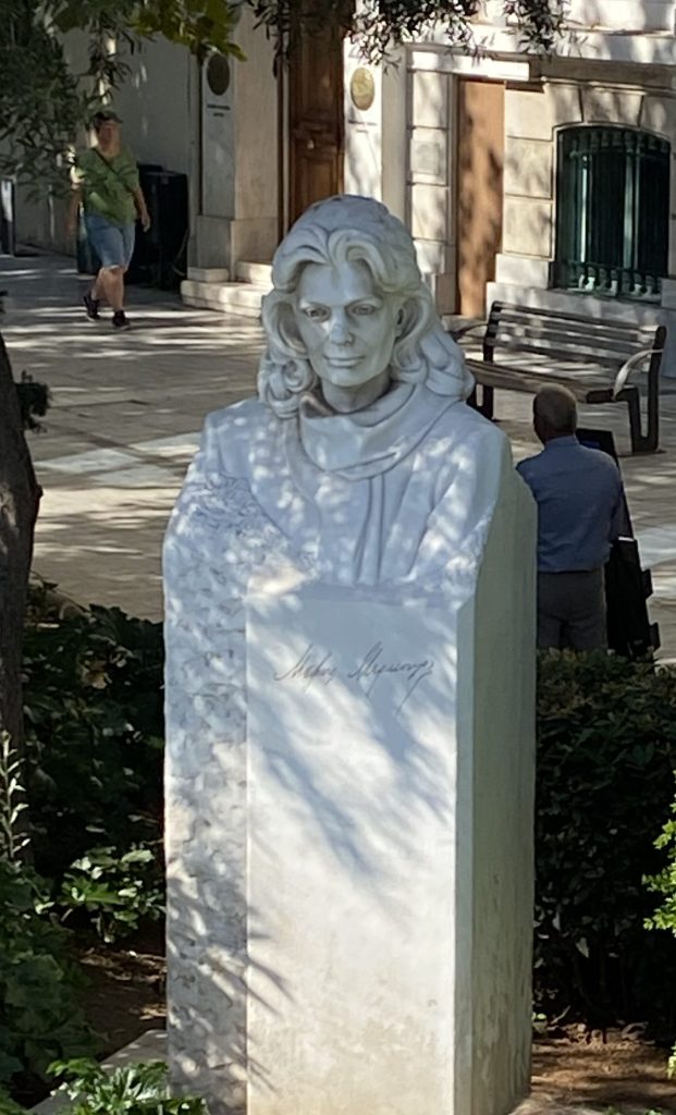 Die Sonne geht unter hinter dem Hafen von Piräus. Der Hafen gehört mittlerweile den Chinesen. Und Melina Mercouri hat ein Denkmal.