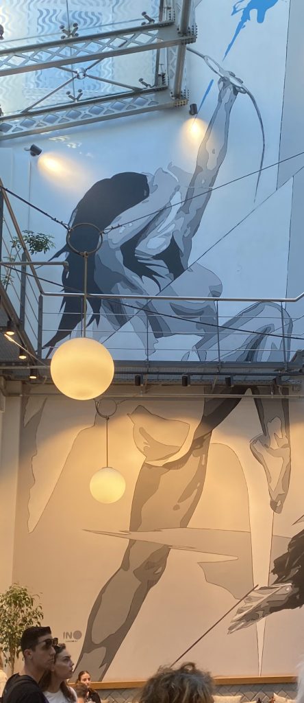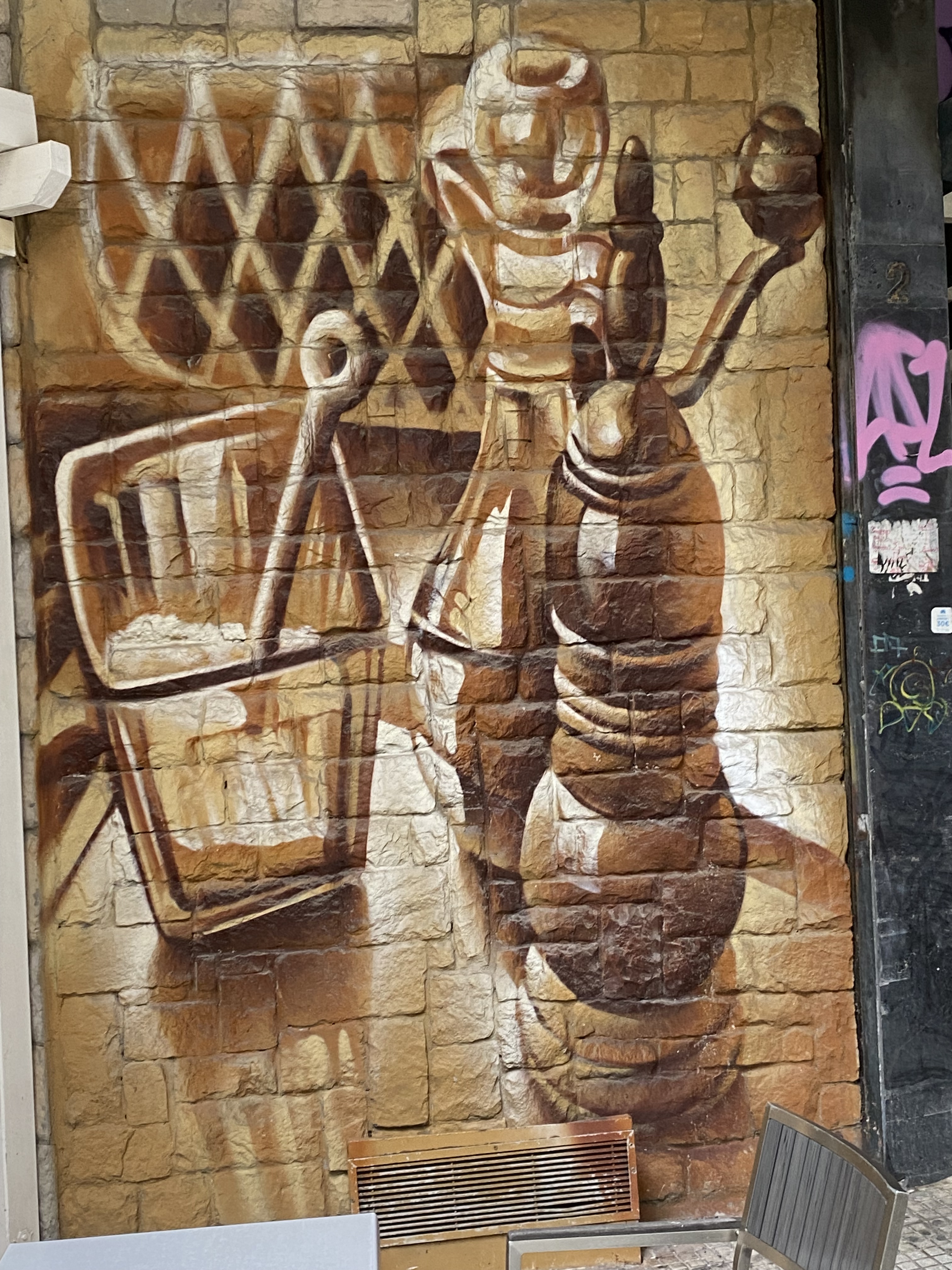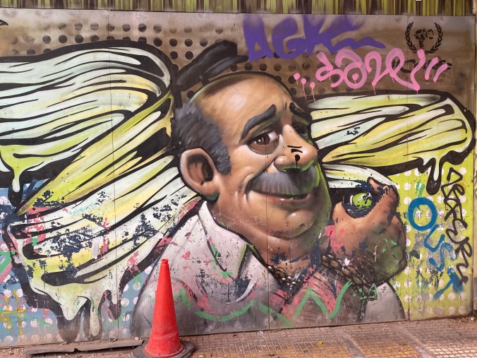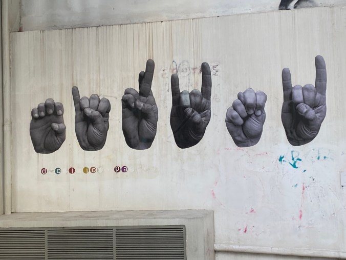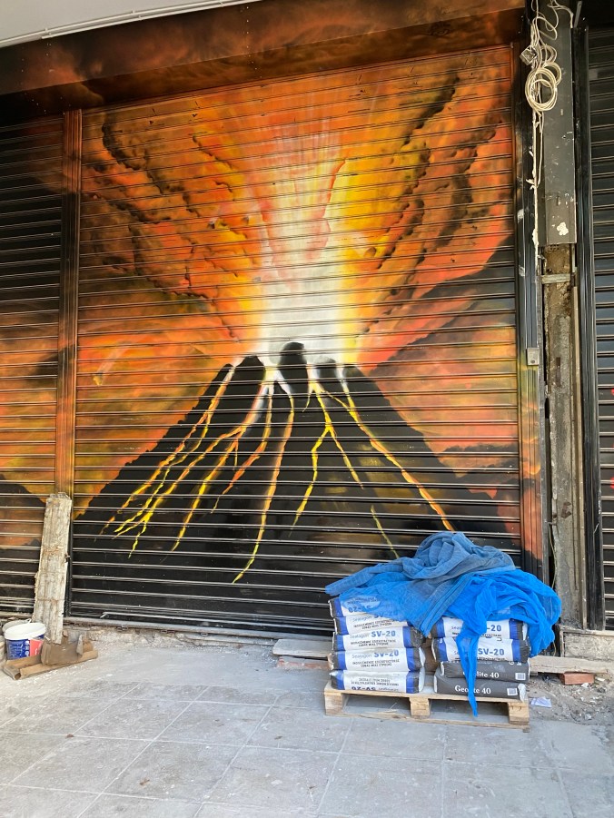Wir haben Glück, es ist Samstag Nachmittag in Athen und die Geschäfte haben zu. Und so sind die Rollläden vor den Schaufenstern geschlossen. Und wir sehen die Werke. Sie sind auch zu finden an den Häuserwänden in Richtung der abgebrochenen Nachbarn. Es braucht ein bisschen Zeit, bis man sich eingeguckt hat.