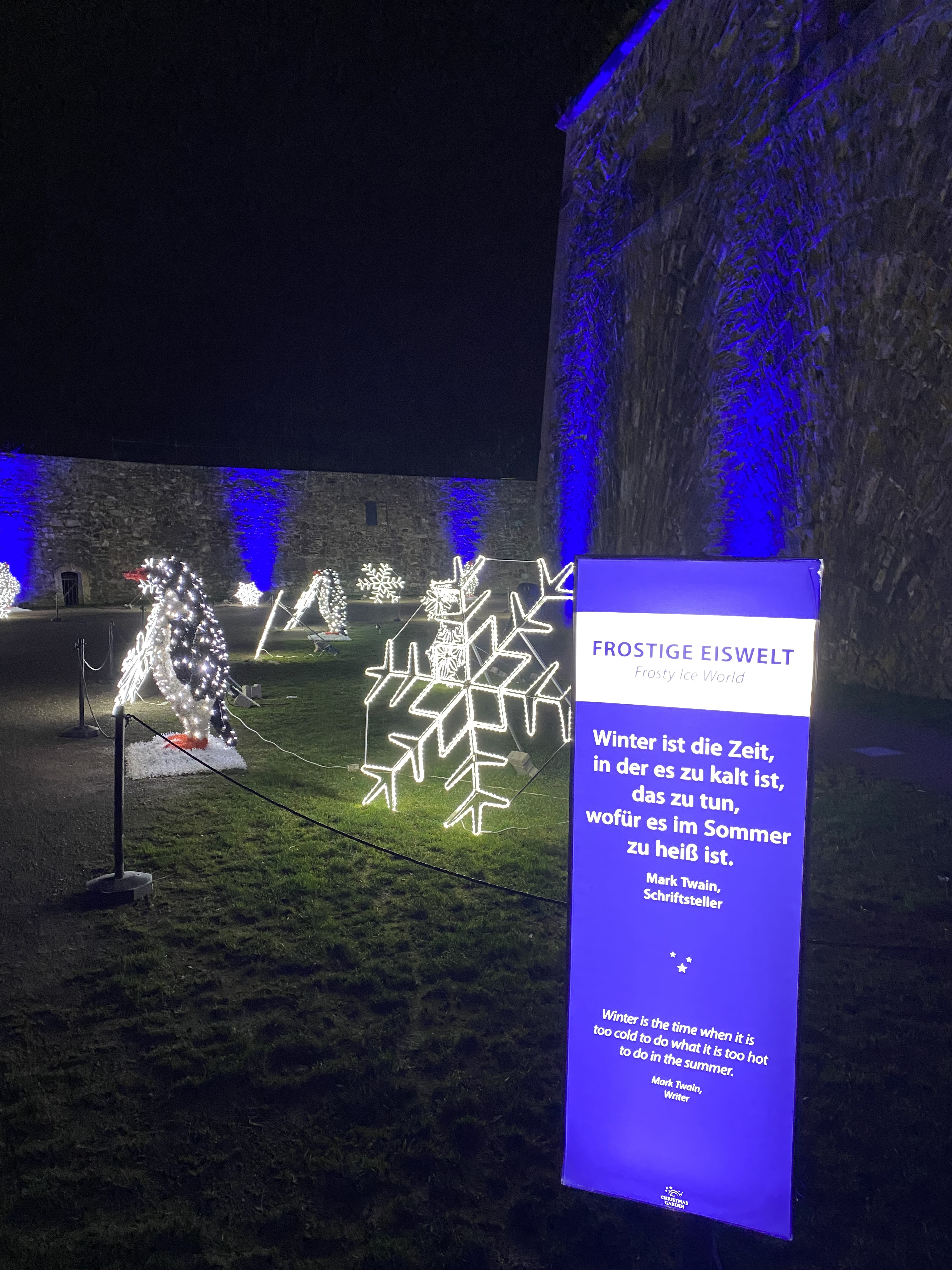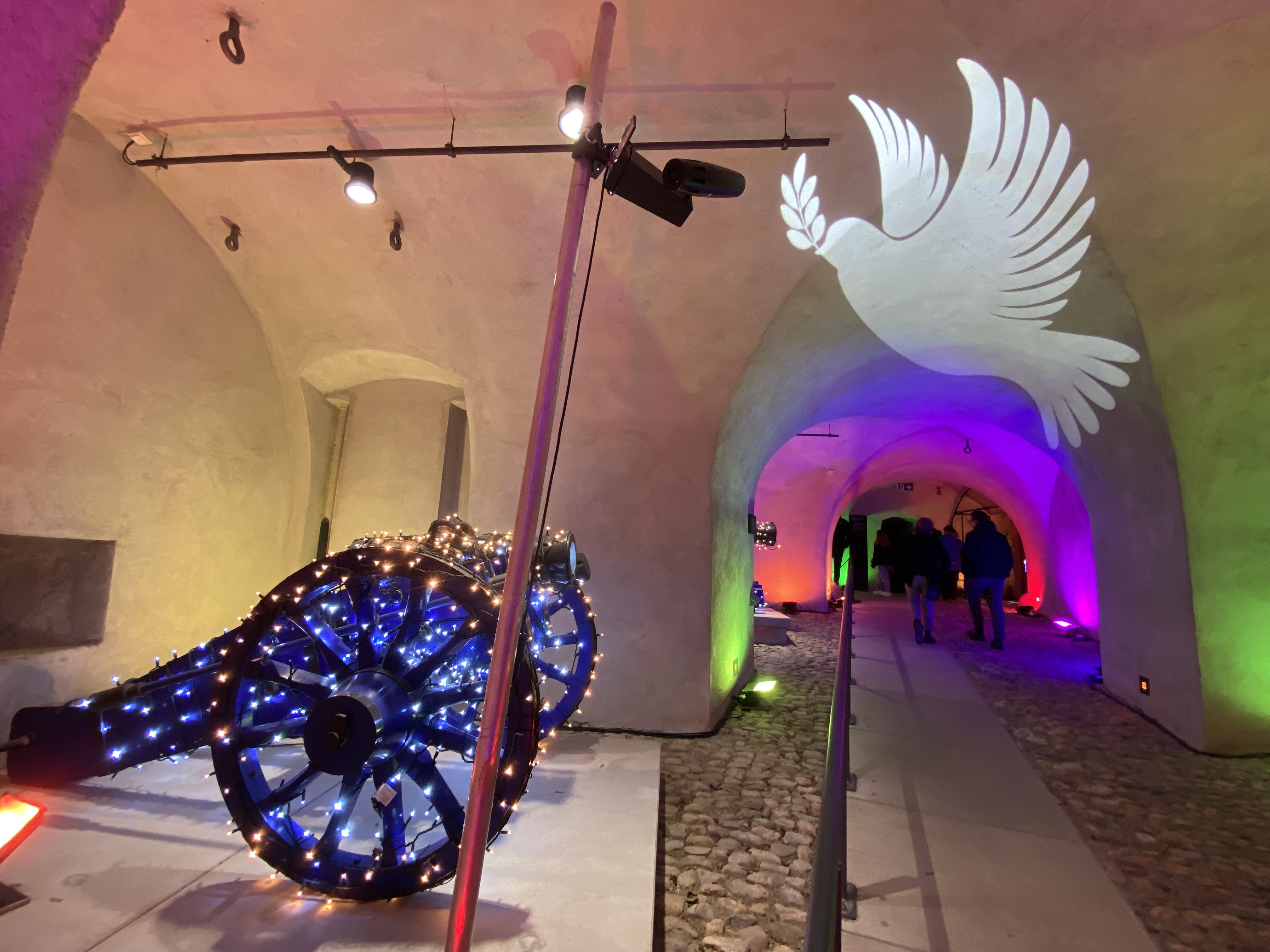 So schleust man auf der Festung die Besucher zuerst durch eine Marienausstellung und an beleuchteten Kanonen vorbei, bevor sie die Lichter von Christmas Garden an den Festungsmauern schauen können.