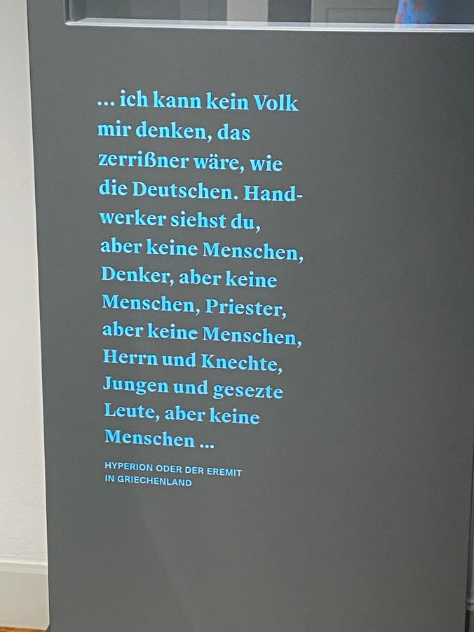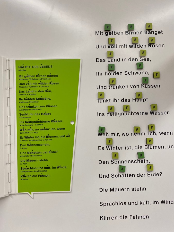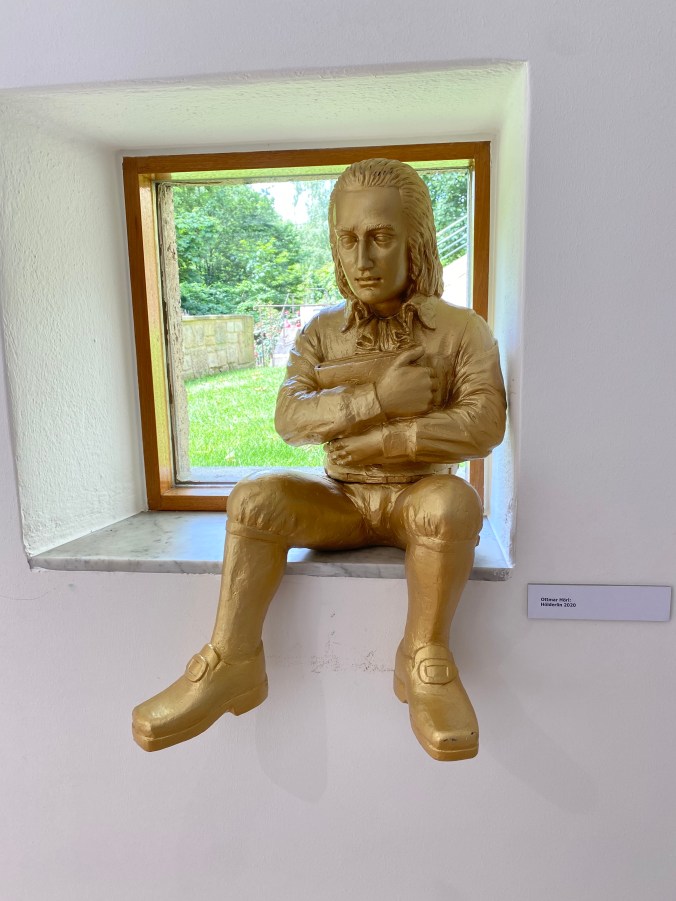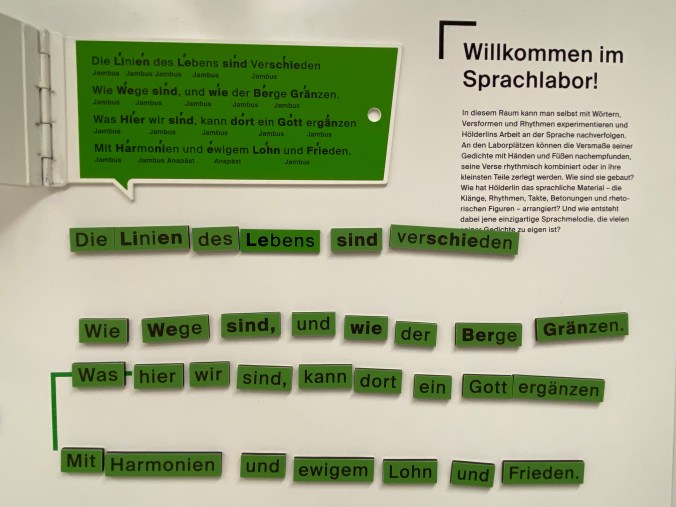 Hier steht ein kleiner Tisch, auf dem er den Rhythmus seiner Gedichte geklopft haben soll. Heute ist man moderner. Man findet einen Kopfhörer, über den man, von einem Schauspieler gesprochen, das Gedicht hören kann und daneben ist ein ein Holzbrettchen angebracht. Legt man die Hand darauf, fühlt man den Takt der Worte.