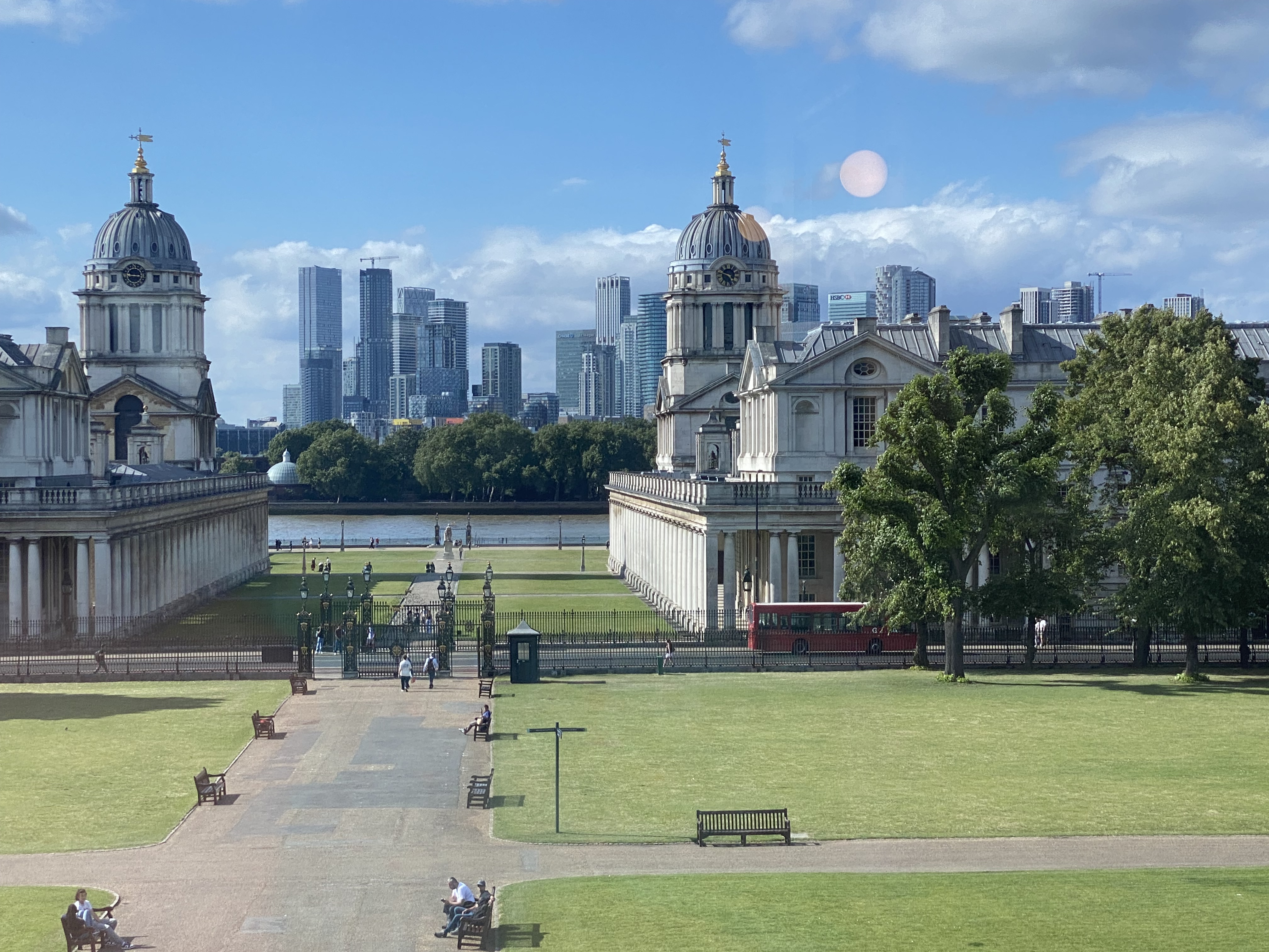 Der Blick fällt auf London, die Themse und die University of Greenwich