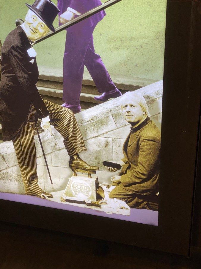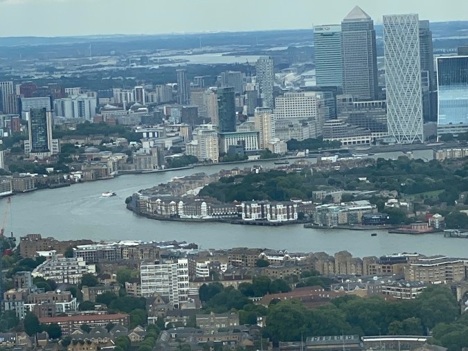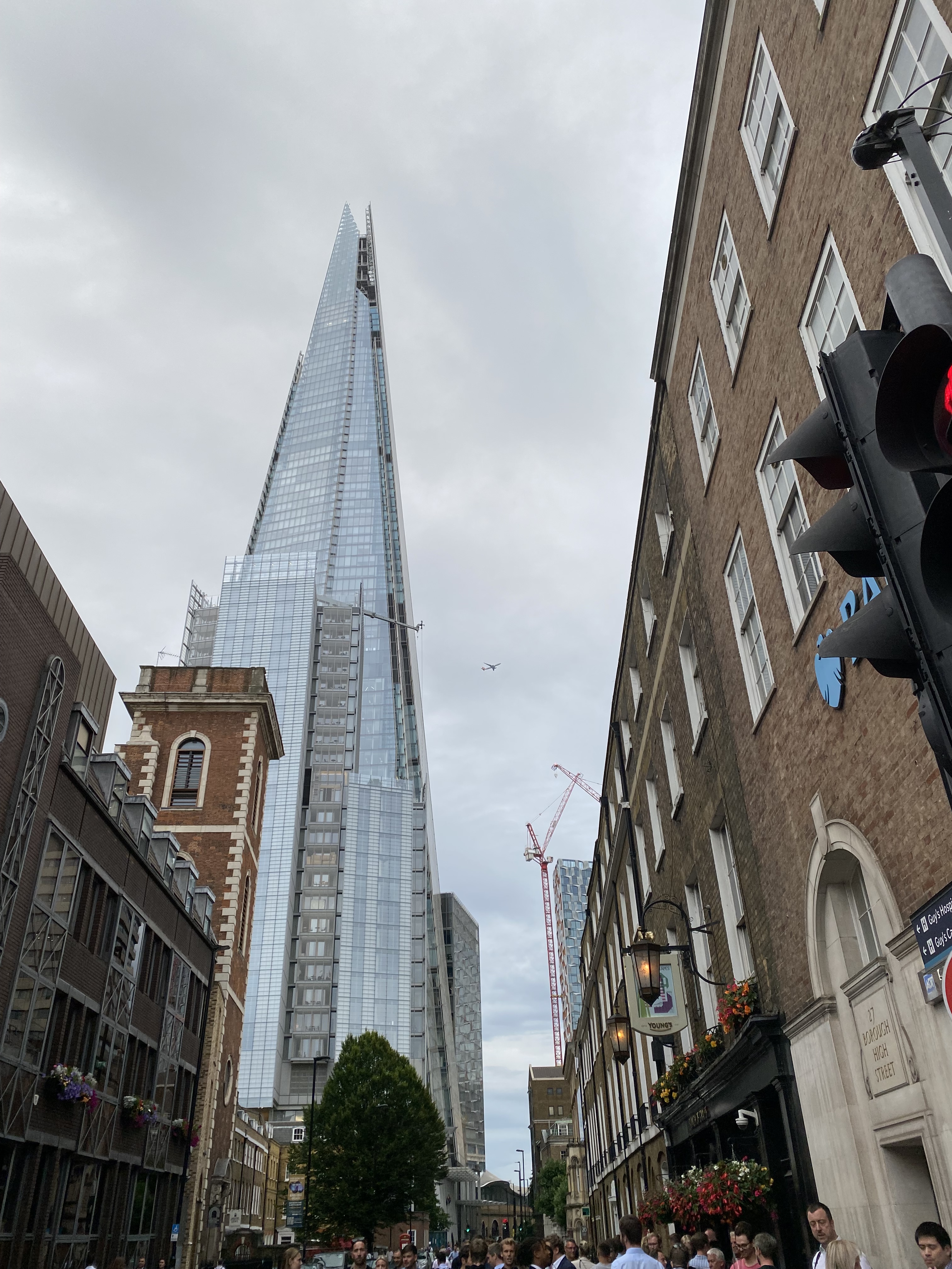Es ist alles etwas lieblos, aber man kann in der Warteschlange witzige Bilder gucken und man wird fotografiert wie im Fantasialand. Oben gibt es einen verglasten Rundgang und es stehen Barhocker rum. Kellner ziehen ihre Kreise, ein Standuptyp erzählt was über Pelikane und man schaut auf London. Und was denke ich? Oberhausen. Man sieht sehr weit hier, aber auch nur London. Der Bahnhof London Bridge von oben sieht toll aus, aber dann bin ich mich gelangweilt nachdem ich ne Weile Zug rein, Zug raus geguckt habe. Und ich weiß warum. Die Menschen sind zu klein als dass man sie sieht. Es sieht aus wie so ne Spielzeugeisenbahn. Dafür stehen die Fenster schräg, so dass man ein wenig das Gefühl hat, nach vorne zu kippen.