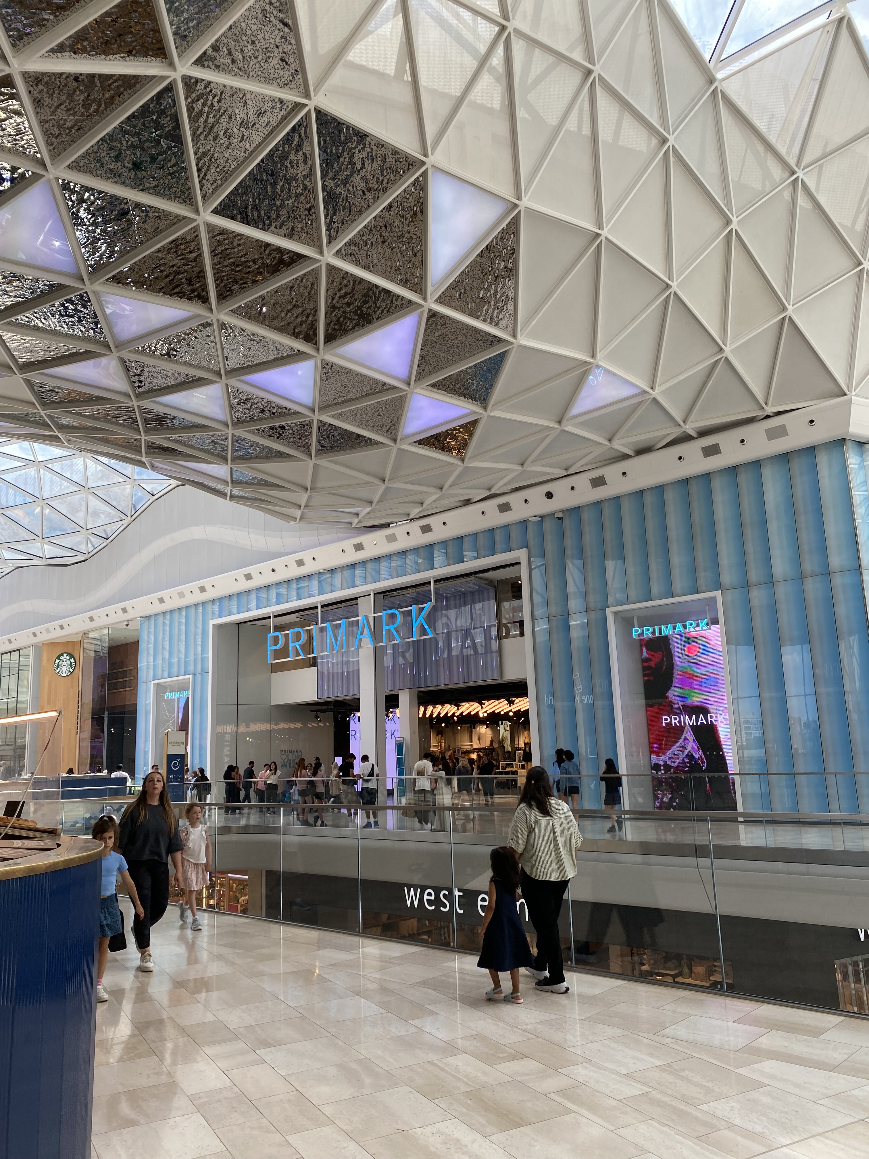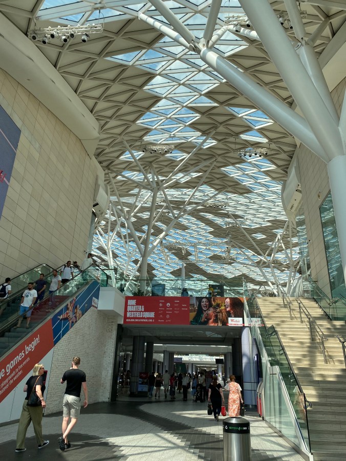 Jetzt ist alles erledigt und wir können Geschäfte gucken. Mehr als Schaufenster gibt es aber nicht, 450 Geschäfte machen mich Landpomeranze fertig. Die grösste Mall Europas! Die größte Deutschlands steht in Oberhausen, sie gehört auch Westfield und ist nur halb so groß. Und die ist mir schon zu viel. Auch das Löhrcenter in Koblenz ist mir zu groß. 250.000 qm zu 125.000 qm zu 32.000 qm, so können Sie es sich vielleicht vorstellen.