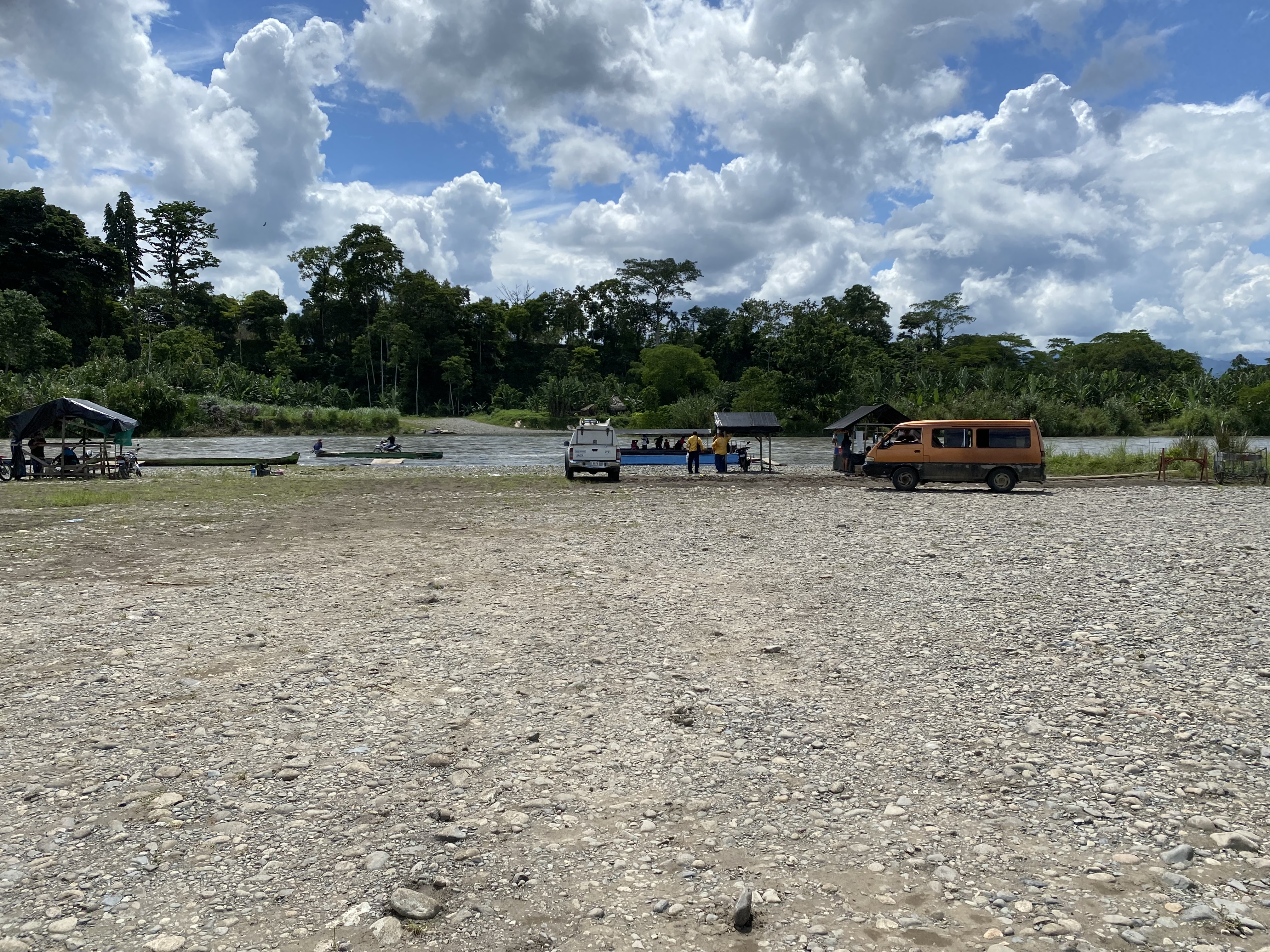 Wir sind dann weiter bis zum Fluss zum Hafen Suretka gekommen. Leider ist die Fähre nur für Personen oder Mopeds und Bananen. Ein Boot war gekentert, so dass der Bananenlaster am anderen Ufer umkehren musste.