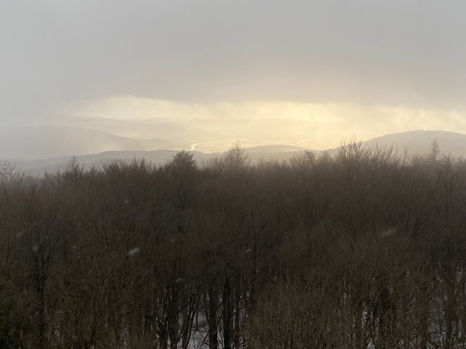 Die Aussicht soll gigantisch sein. Wir haben halt viel Nebel und ein paar Lichtblicke Richtung Süden.