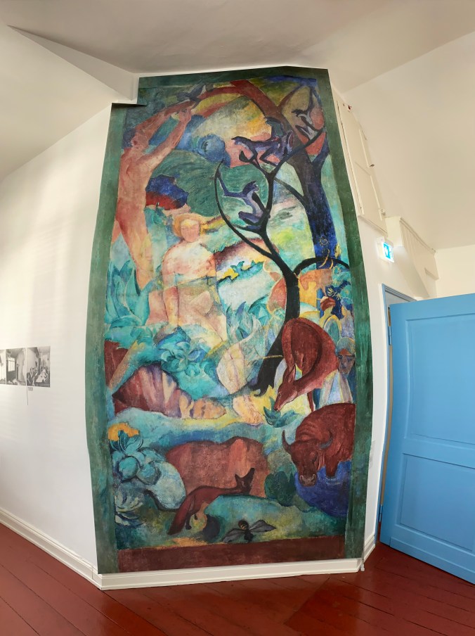 In seinem Atelier im Dach hat er und ein Besucher ein Bild an die Wand gemalt. Der Maler, Sie erraten es vielleicht, war Franz Marc, ein guter Freund von ihm.