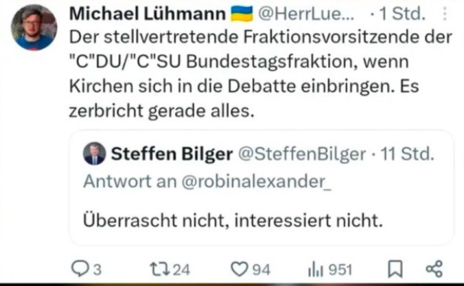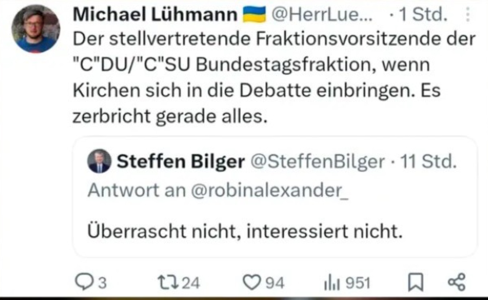 „In einer ersten Reaktion der Christdemokraten gab sich Steffen Bilger, stellvertretender Fraktionschef von CDU und CSU im Bundestag, wenig beeindruckt vom Vorstoß der Kirchen. „Überrascht nicht, interessiert nicht“, kommentierte Bilger das Statement der Kirchen am späten Dienstagabend auf der Plattform X.“Quelle