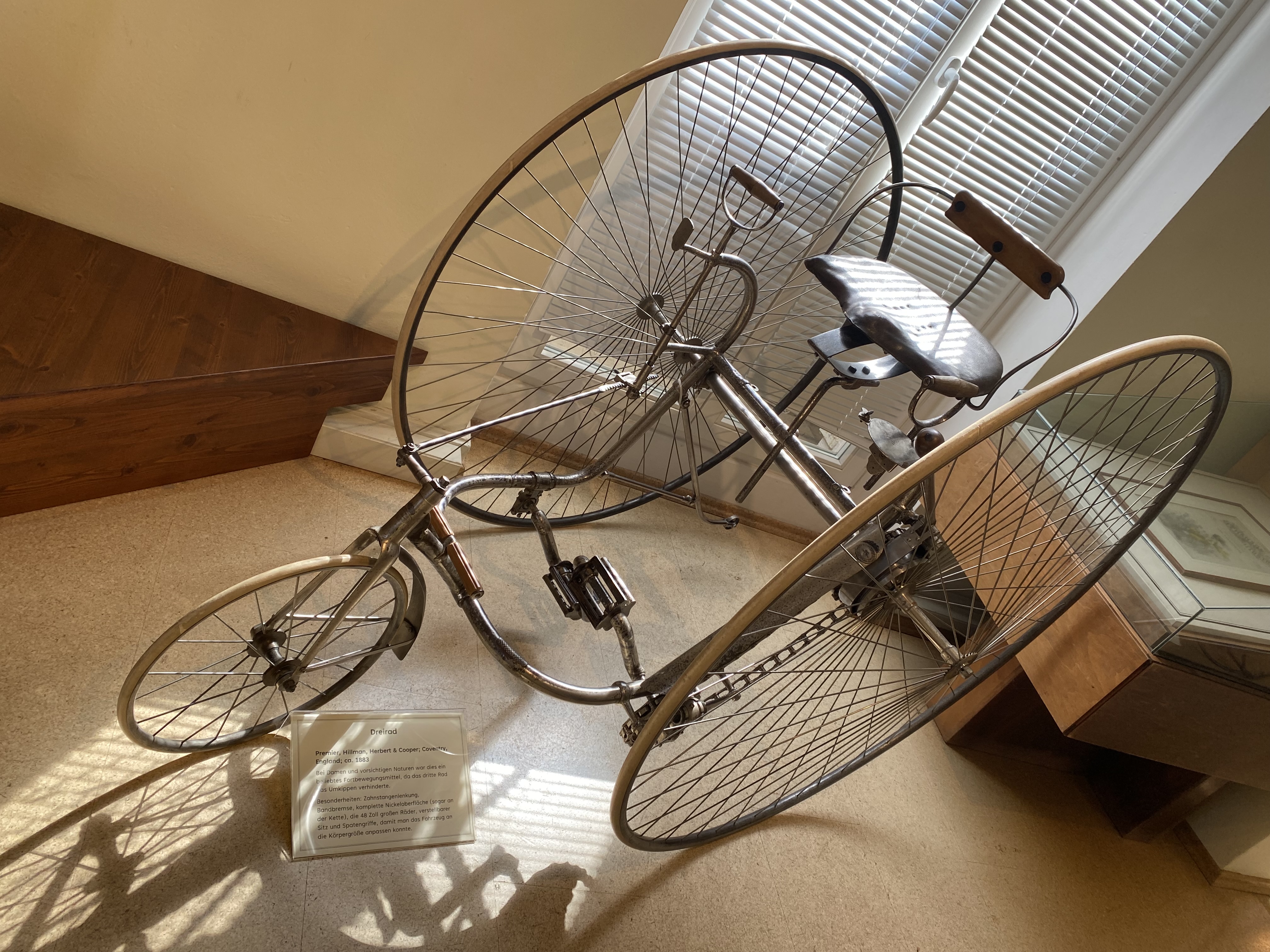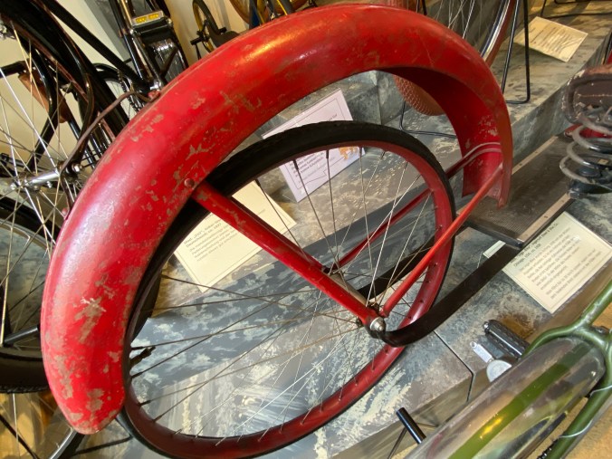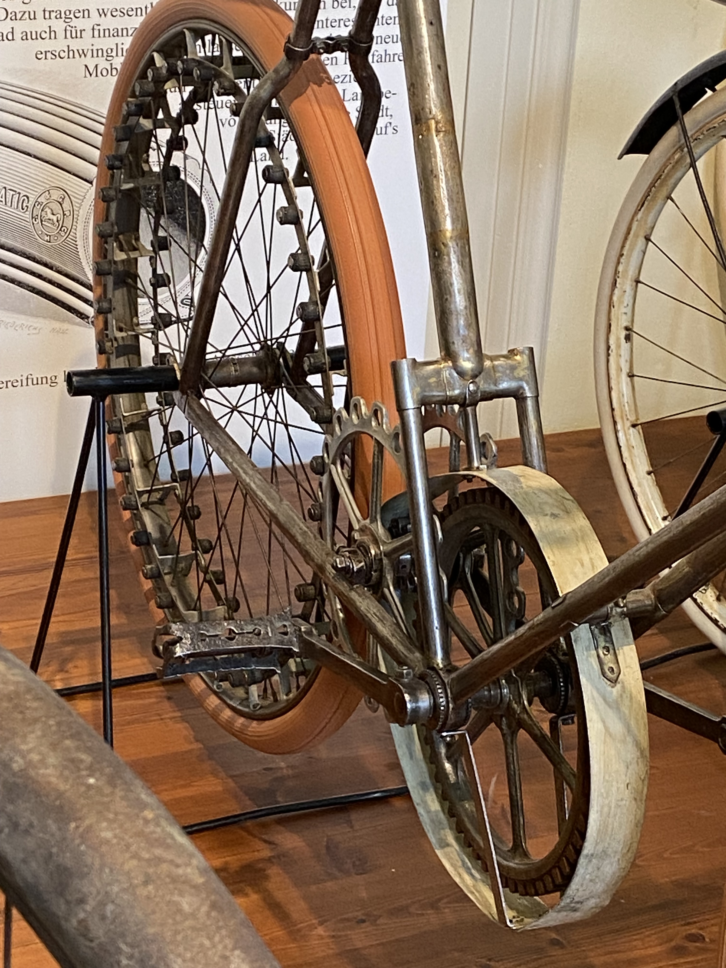 Materialen wurden ausprobiert, Bambus, Holz, Aluminium, um die Räder leichter zu machen. Die Nabe musste nicht in der Mitte sein. Man hatte geflochtene Körbe, um die wertvollen Räder beim Transport nicht zu beschädigen. Und man fand eine Möglichkeit, wie man verhindern könnte, dass die Kleidung sich in den Speichen verfingen.