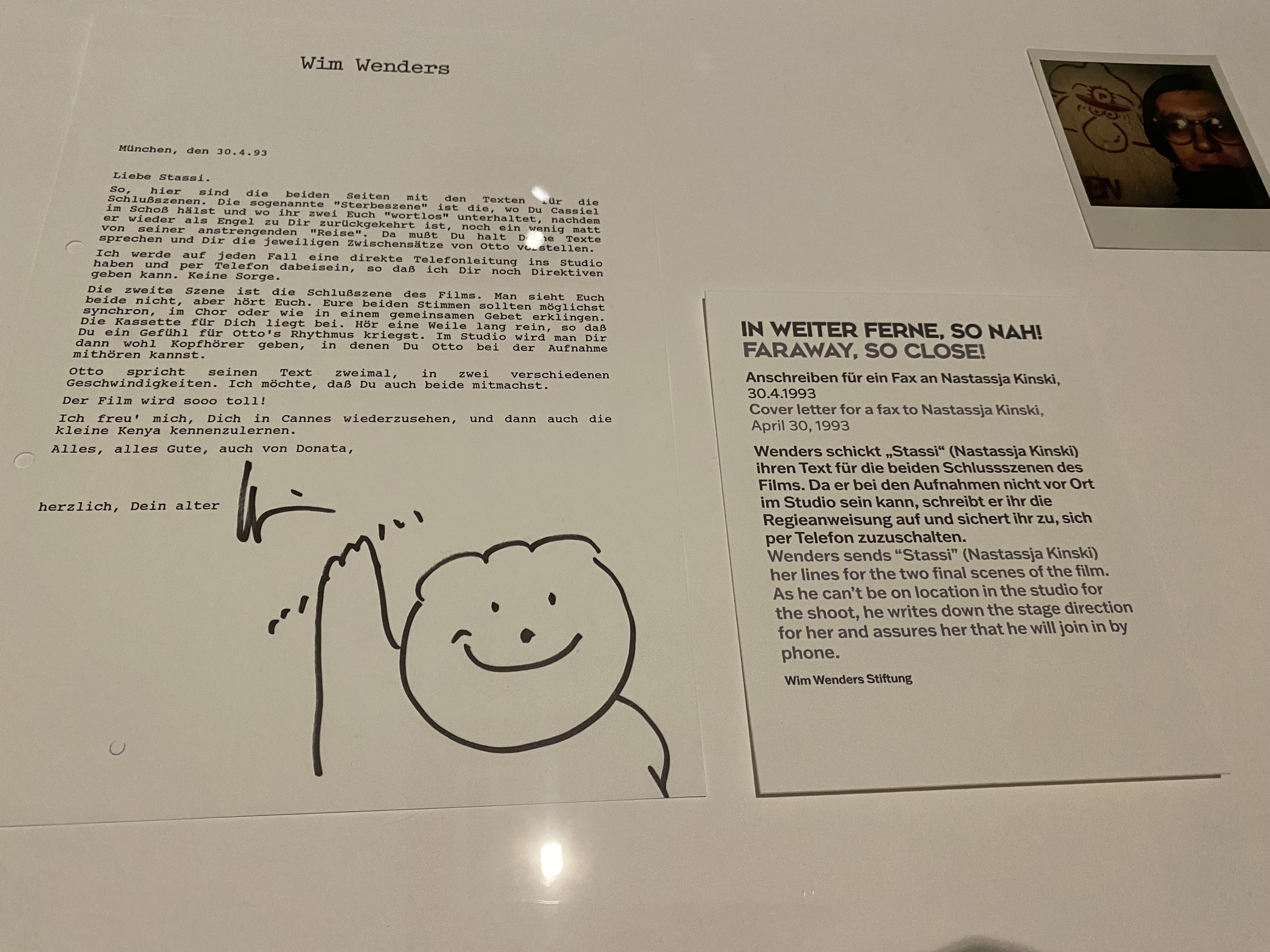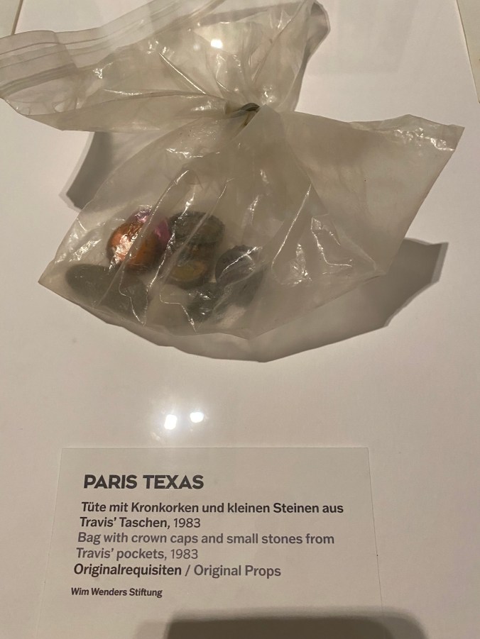 Und Stempel des Architekten Tadao Ando mit seinem Konterfei, die Regieklappe von Paris Texas und den Beutel von Trevis. Es liegt seine erste Filmkamera da, die er mit 12 bekommen hat. Und man kann rührende Kinderzeichnungen von ihm sehen, die schon den besonderen Blick auf die Welt zeigen.
