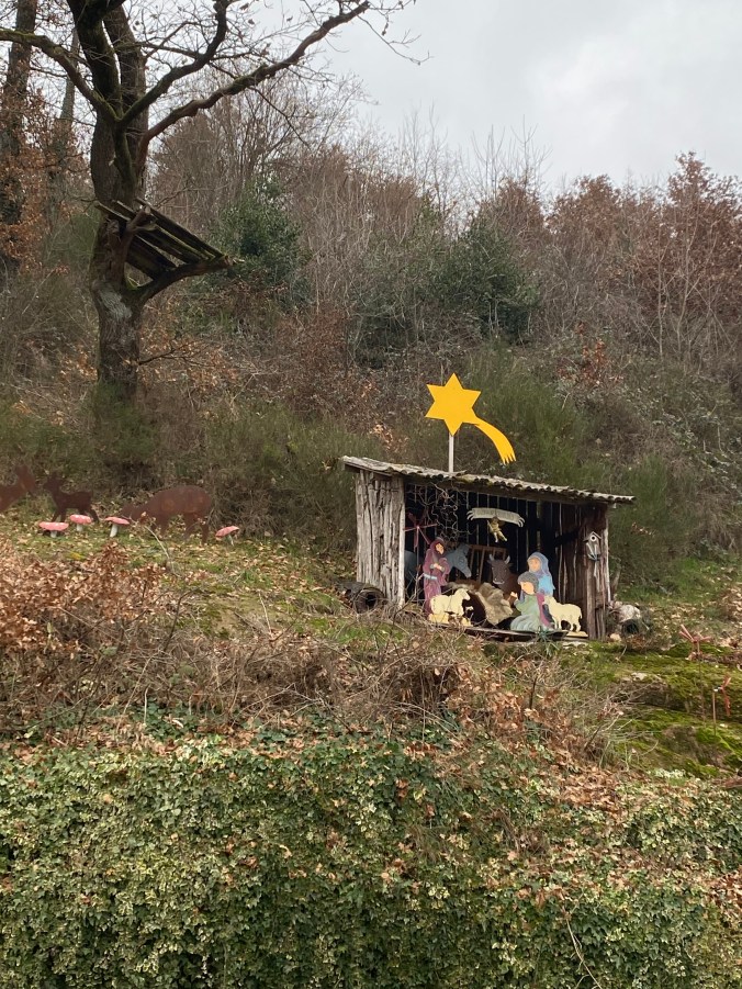 Bei der Krippe steht ein Bauer, der uns erklärt, dass er sie selbst gemacht hat, zusammen mit seiner Schwester.