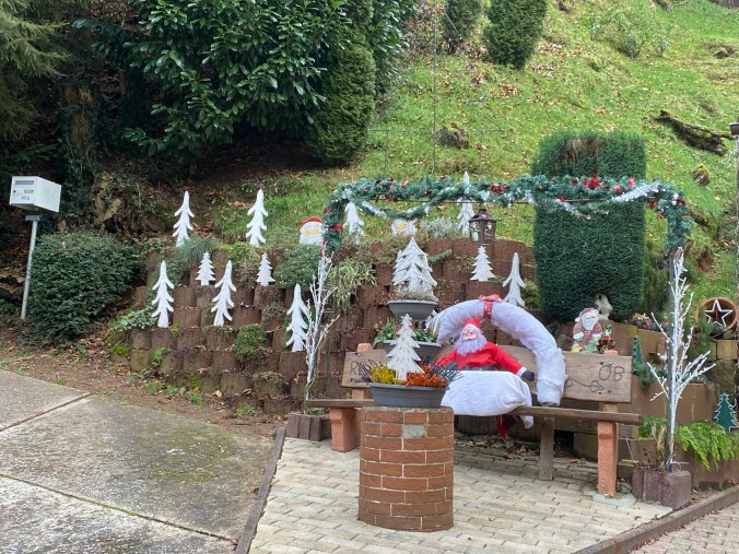 Es bläst ein kalter Wind aus Osten. Ich halte es keine fünf Minuten draußen aus trotz Fellmütze. Rumcruisen geht. Und man sieht in Nordfrankreich liebevolle Dekorationen in jedem Dorf.