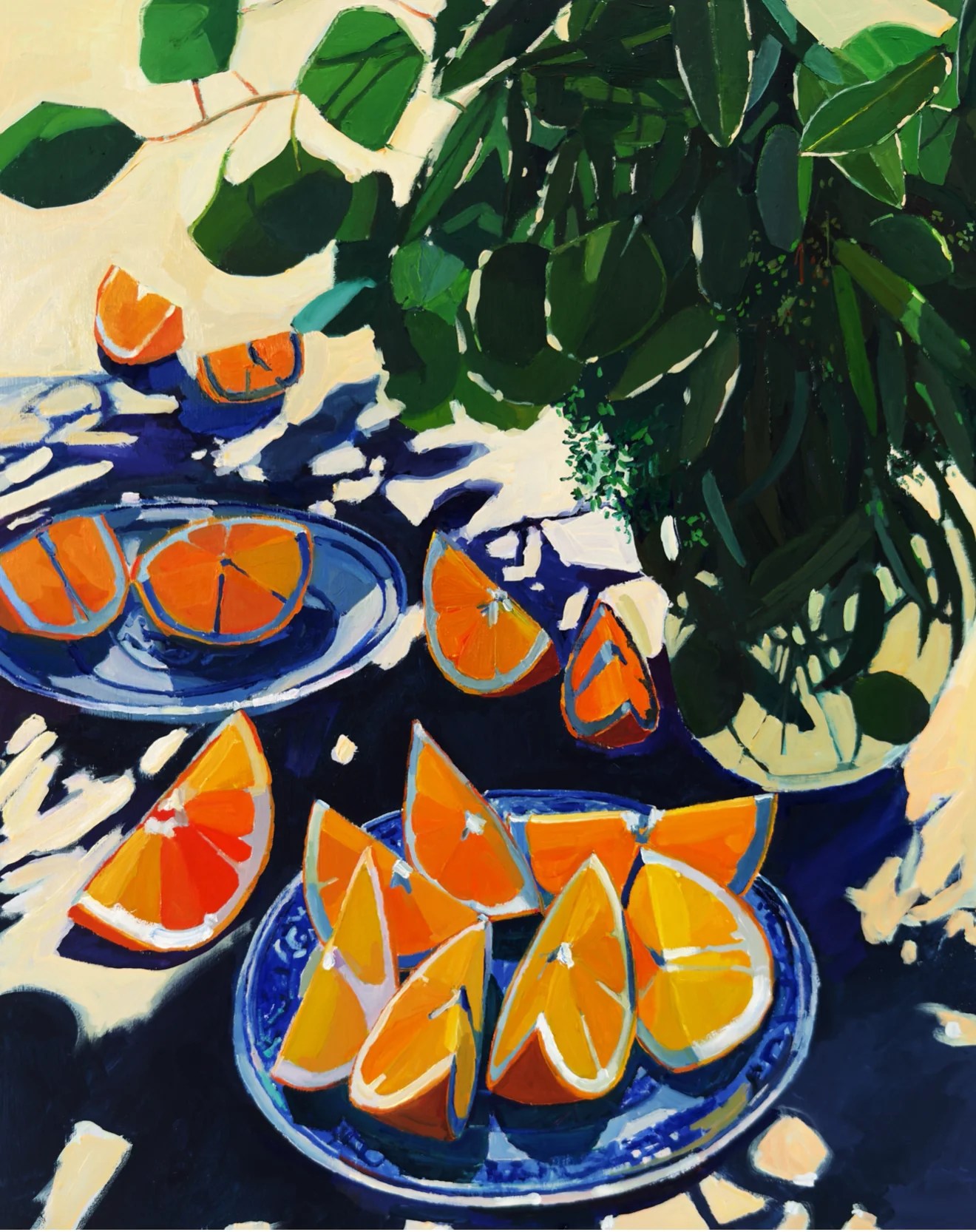 Auf Bluesky habe ich auf die Bilder eine Frau gesehen, die Malerin Erika Lee Sears. Sie malt Orangen, Martinigläser und Porsche. Und sie malt einen Haufen dreckiger Wäsche, den Boden der Dusche und sich in der Badewanne. Hier.