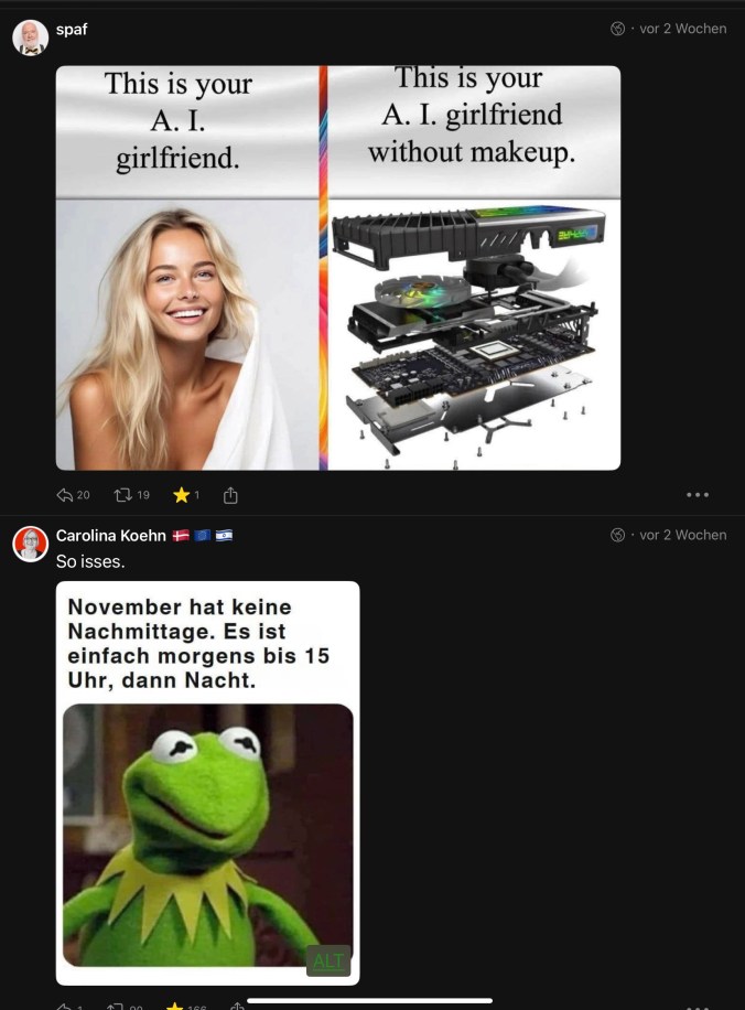 Mich gruselt es ja vor Maschinen, die tun, was sie wollen. Im Dorf laufen im Sommer überall die Rasenroboter rum. Manchmal fahren sie sich fest, manchmal rutschen sie die Kellertreppe runter. Und sie melden es gleich selbst ihrem Besitzer, dass da was los ist. Angeblich ist das auch ein guter Diebstahlschutz. Die einen haben ein Kabel vergraben, das die Leitlinen vorgibt für die Mähroute, andere haben schon einen GPS-getracktes Wunderteil, das anhand der Signale aus dem All programmiert wird. Dumm nur, wenn das Update schief läuft und er zieht nachts los und jagt Igel oder findet doch die Kellertreppe. So mutige Maschinen mag man dann doch nicht. Die selbstfahrenden Autos in den USA sind jetzt auch auf „mutiger“ programmiert worden.